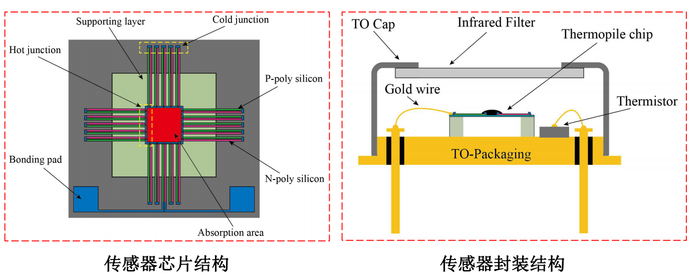 CSTsensor(中测传感器)的红外热电堆温度传感器 CTFTO3901系列是基于热电堆的硅基红外传感器。大量的热电偶堆集在底层的硅基上,底层上的高温接点和低温接点通过一层极薄的薄膜隔离它们的热量,高温接点上面的黑色吸收层将入射的放射线转化为热能,由热电效应可知,输出电压与放射线是成比例的,通常热电堆是使用BiSb和NiCr作为热电偶。