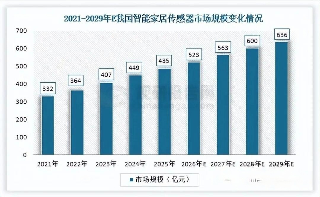 在智能家居领域,传感器是智能空调、智能冰箱、智能洗衣机、智能安防系统等实现联网交互与自主决策的核心部件。消费者对生活品质提升、安全便捷需求的持续升级,驱动智能家居行业不断发展壮大,也为传感器行业带来持续需求增量。数据显示,2021年至2025年我国智能家居市场规模由5800.5亿元上升至8880.1亿元,预计2029年将达到约11433亿元,2021年至2029年年均复合增长率约为8.85%。与此同时,智能家居传感器市场规模也在不断扩大,由2021年的332亿元增长至2025年的485亿元,预计到2029年将上升至636亿元,2021年至2029年年均复合增长率约为8.47%。