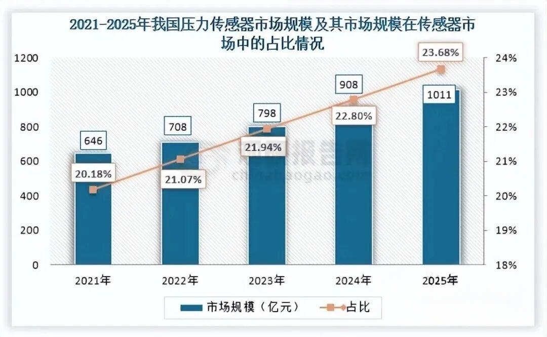 目前,我国传感器行业已形成多元化产品矩阵,涵盖压力传感器、温湿度传感器、气体传感器、流量传感器、运动传感器、距离传感器、图像传感器、位置传感器等细分品类。其中压力传感器为第一大细分品类,在工业自动化、新能源汽车、消费电子及医疗健康等领域需求驱动下,市场规模从2021年的646亿元增至2025年的1011亿元,年均复合增长率达11.85%,显著高于行业整体增速,占比也由20.18%提升至23.68%,龙头地位稳固。
