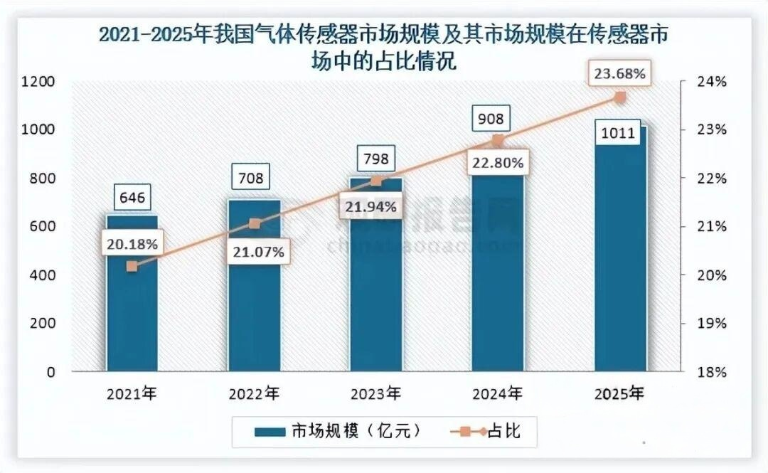 值得注意的是,在环保政策加码与新能源汽车电池安全监测需求双重拉动下,气体传感器市场规模快速扩大,由2021年的35亿元增至2025年的65亿元,并以16.74%的年复合增长率成为传感器领域增长最快的细分赛道,同时市场规模占比由1.09%提升至1.52%。